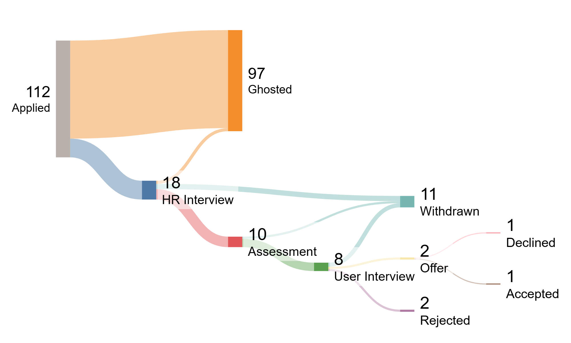 I visualized the application flow using a Sankey diagram to show all paths from Applied to final outcomes, including ghosted, withdrawn, rejected, declined, and accepted. This shows not just overall movement but the distribution of outcomes at each stage.
