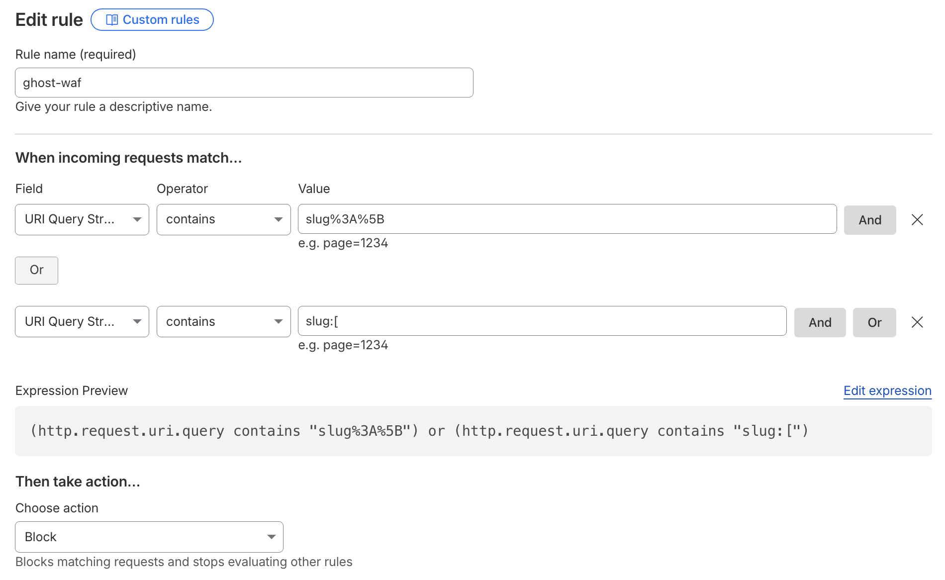 Action: Block, then saved & deployed. Some legitimate slug filters may break, but I accepted that risk until everything stabilized.
