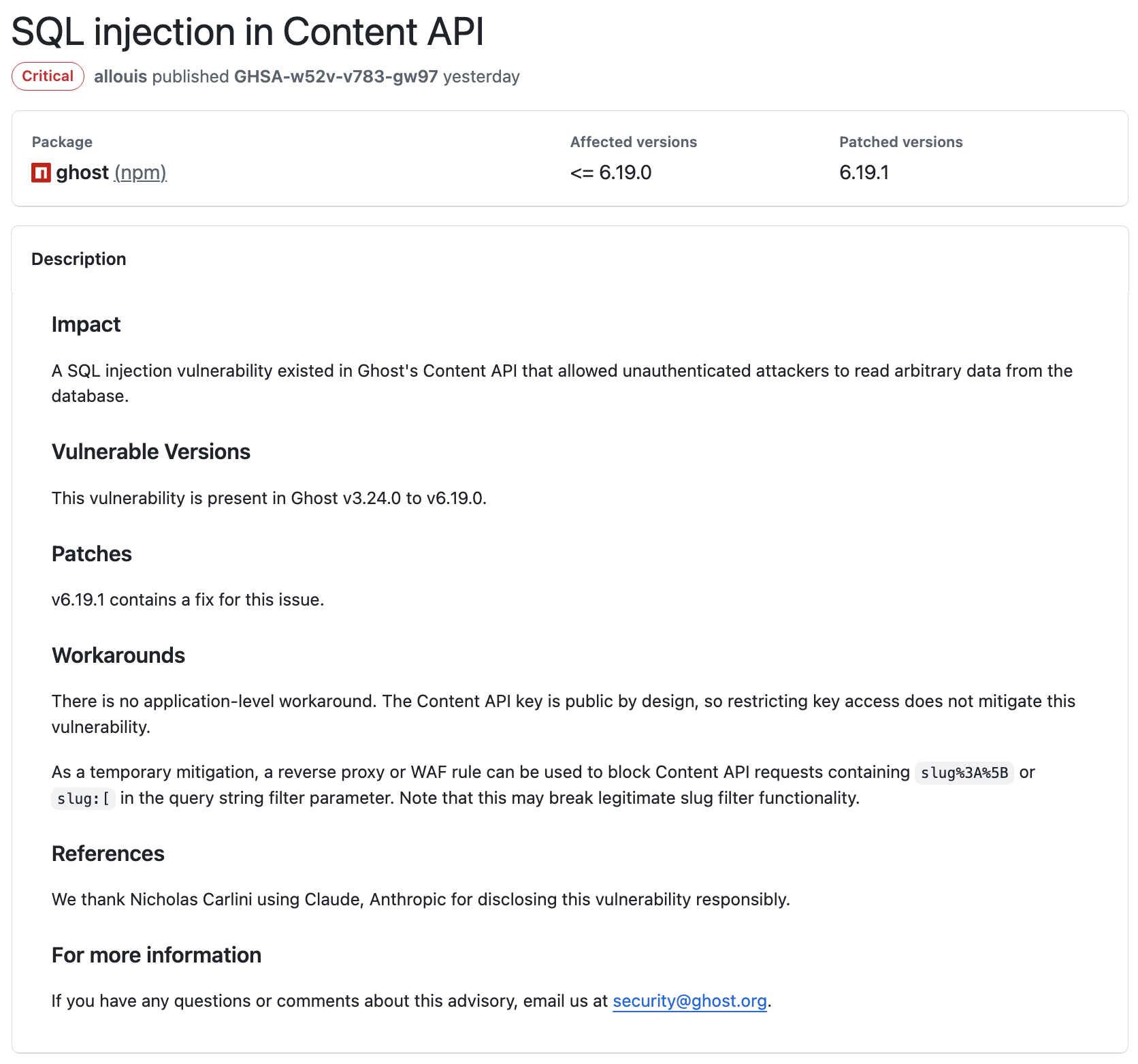 For reference, the official Ghost security advisory is here: https://github.com/TryGhost/Ghost/security/advisories/GHSA-w52v-v783-gw97